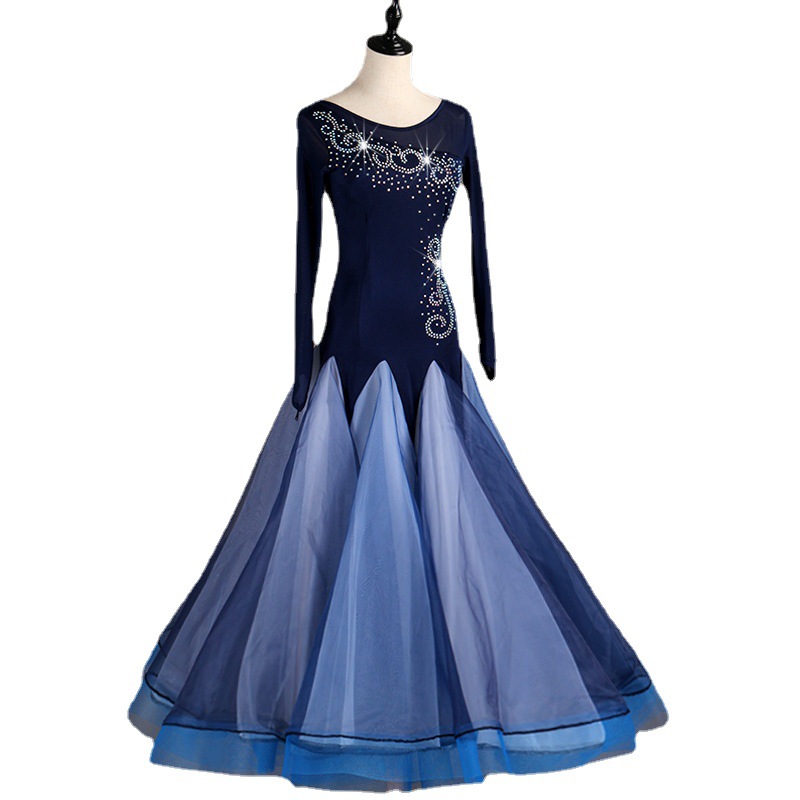 裾に向かって広がるシルエットが回転動作を美しく見せ、社交ダンスの優雅さを引き立てます。
